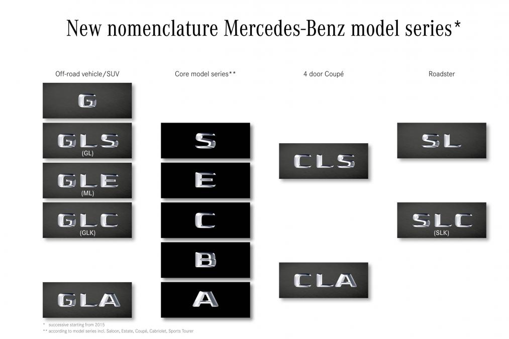 Автопроизводитель рационализирует стратегию наименования моделей в основных классах: S, E, C, B и A, которые обозначают тип кузова. Все внедорожники получат префикс GL, следующая же буква будет обозначать класс модели, на которой она основана. Таким образом, нынешний GL станет GLS, а ML в свою очередь переименуют в GLE. Новый GLC выйдет в следующем году в Великобритании, наряду с уже вышедшим GLA.